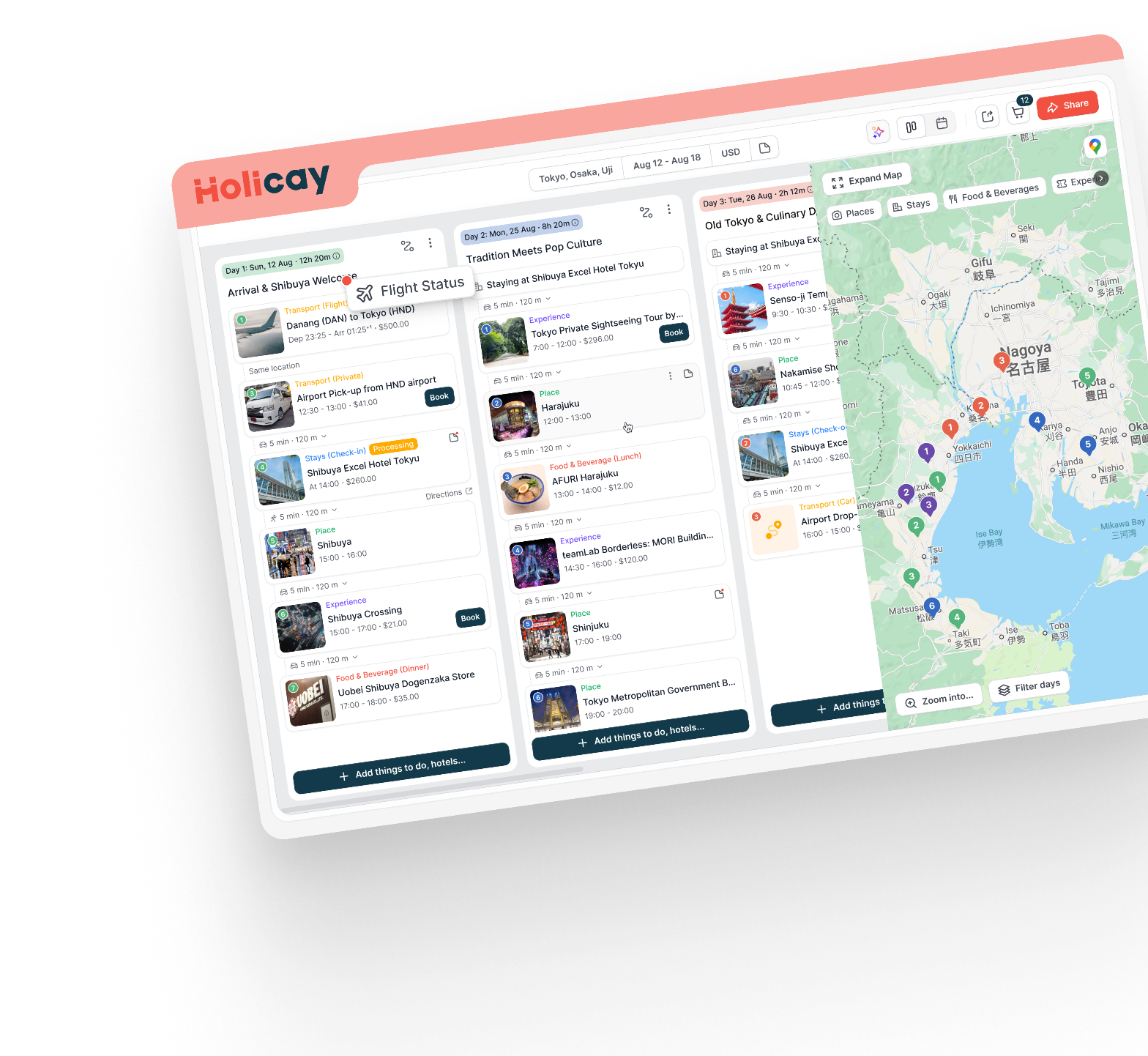Holicay is the #1 travel planning app built to manage your entire trip — from planning to real-time coordination. It combines your itinerary, bookings, live updates (flights, weather, transport), and expenses into one place, so your trip stays organized even while it's happening.