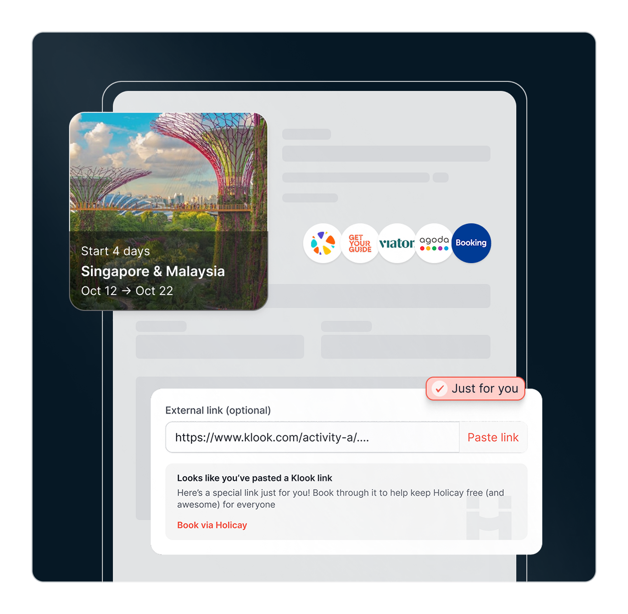 Already booked elsewhere? Simply paste your hotel booking link, flight confirmation, or activity reservation into your Holicay itinerary. Keep third-party bookings organized in one structured travel plan, even if you didn't book through us