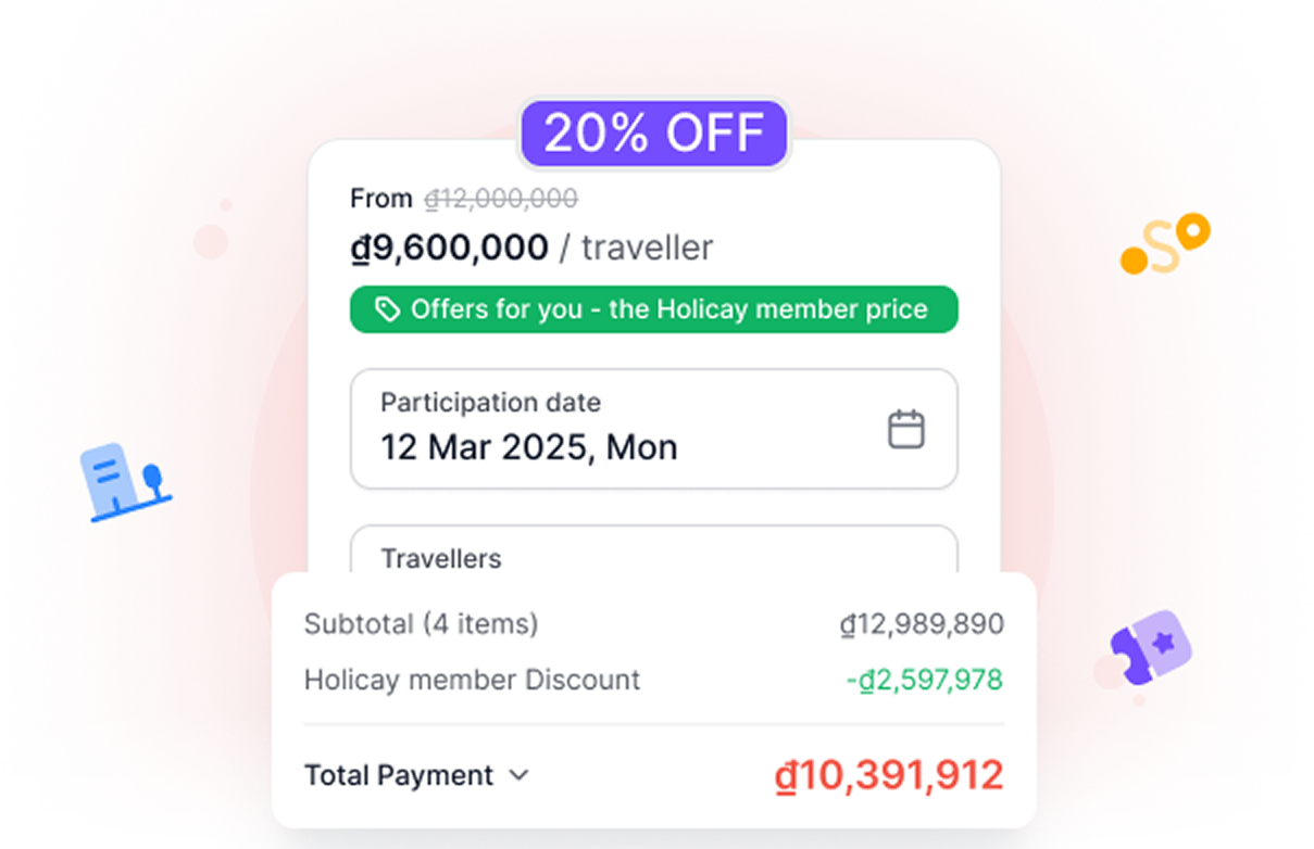 Holicay Pro members unlock exclusive rates on hotels and experiences that aren't available to the public. Save up to 20% on every booking automatically — no coupon codes, no hunting for deals, just better prices every time you travel.